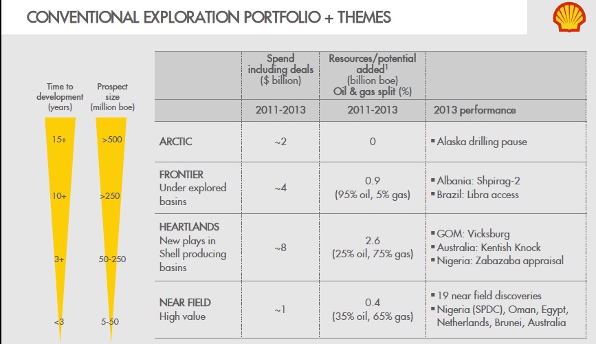 A knee-jerk reaction to a higher number like that would be to think Shell brought on more oil than natural gas, which costs more to develop but is generally considered more valuable. This isn't the case, either: Of the 620 million barrels of oil equivalent that were added to Shell's reserves in 2013, close to 86% was natural gas. One thing to consider with these numbers, though, is that Shell has had a relatively unsuccessful exploration program in the recent years. Of the $5 billion it spent on exploration, $3 billion delivered only dry holes.