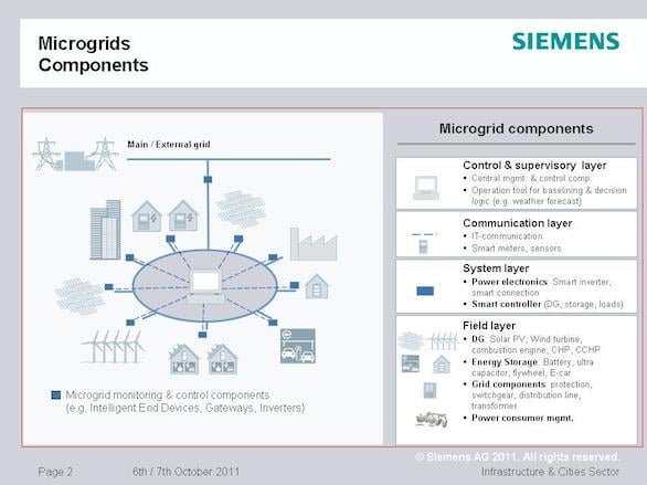 It may contain distributed solar on rooftops, ground mounted wind and solar generation, smart meters, energy storage, and even demand response. The main electric grid would then feed into a central point that would control all points of the system and communicate with the main grid, which would still provide a feed of energy to the microgrid. Below is a graphic from Siemens, a large grid supplier, that shows what a microgrid may look like.