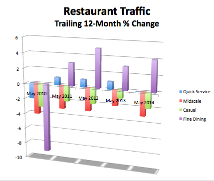 Restaurants, generally, still face a divided future as NPD Group found there was little growth in consumer visits to U.S. restaurants during the early part of the year and unit growth barely budged higher, but that mostly came from fast-food joints pushing their store counts higher. Full-service restaurant units dropped 1% year over year. Worse, traffic at casual dining and midscale restaurants, both of which are in the full service category, fell 3% and 4%, respectively.