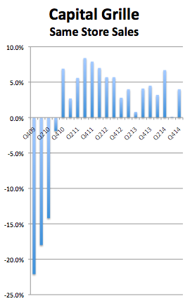 As part of Darden's specialty restaurants, The Capital Grille has helped the group grow revenues to $342 million last quarter, up 15.9% from the year ago period, primarily as a result of higher same store sales, but also from new restaurant openings. The Capital Grille's comps were 3.4% higher for the fiscal year and were up 4% in Darden's fiscal fourth quarter, making it the 17th consecutive quarter of positive same restaurant sales.