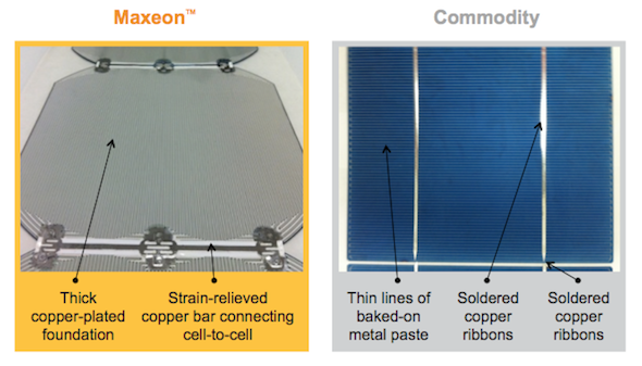 In a traditional solar cell, the busbars seen running along the top of the cell are then connected to the cell next to them and so on. If a cell or busbar breaks the entire panel can be compromised. This is problematic because thermal cycles can crack the silicon base or the conductors of a solar cell. With the solid copper foundation SunPower reduces that issue.