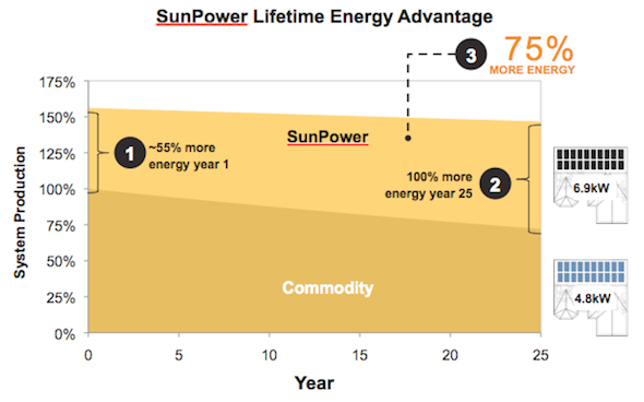 Below you can see SunPower's projection of its power advantage over the lifetime of a solar system, driven by the construction I've outlined above.