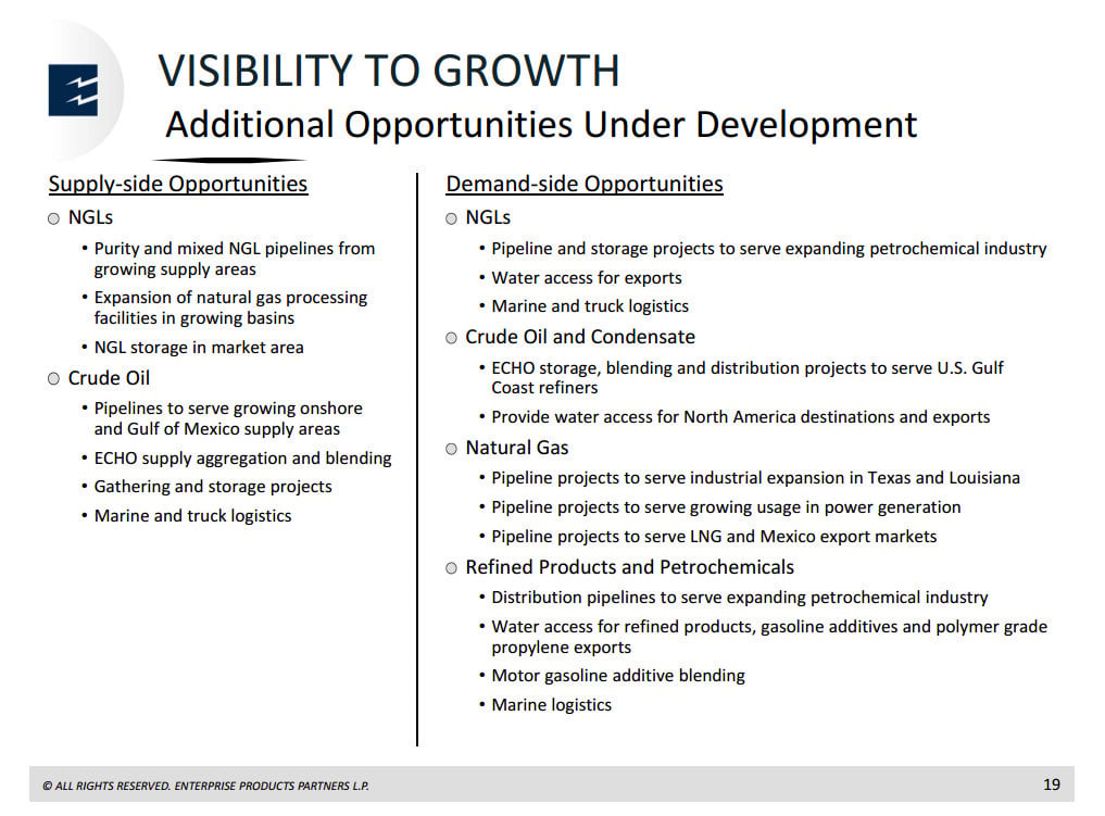 For example, EOG Resources has added five new oil plays to its portfolio of drilling projects in the past year alone. Because of this, its drilling inventory has expanded from 12 years to 15 years in just the past year. This is visible, organic growth that will drive cash-flow generation to keep its dividend heading higher in the years ahead. Likewise, Enterprise Products Partners will be spending $12 billion through 2016 on growth capital projects, which will support a higher distribution in the future. Further, as the following slide points out, the company sees additional opportunities beyond its current spending plans because of the growing North American energy market.