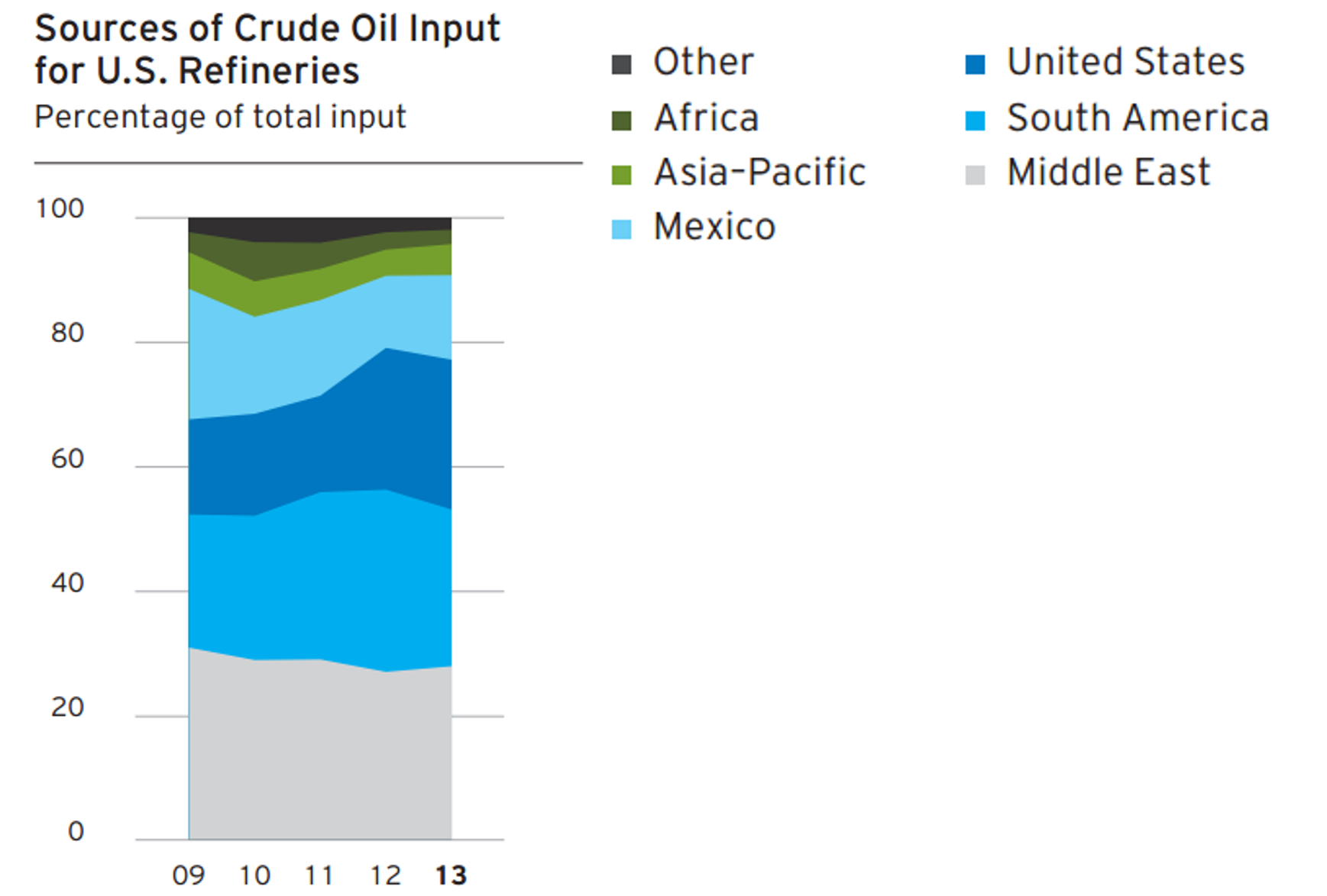 Quite possibly the most egregious example of this is BP's Whiting refinery in Indiana. It recently completed a $4 billion upgrade at the facility to modernize it as well as add a 102,000 barrel per day hydrocracker unit. These upgrades not only increased capacity, but they also completely changed the type of oil the facility processes. Now, Whiting is geared to run 80% heavy/sour crudes, which is the type of oil produced from Canadian oil sands. These crudes are generally less expensive, and refineries that can run this type of crude in the U.S. can reduce their feedstock costs.