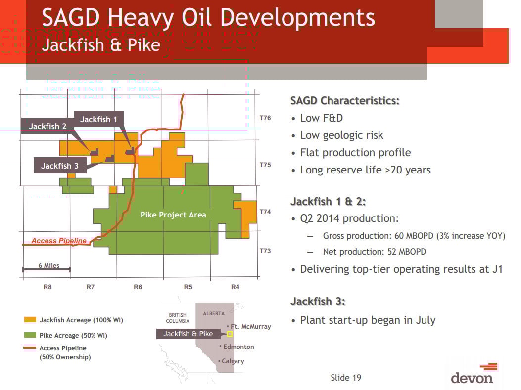 Looking ahead, Devon Energy expects its Canadian oil sands operations to begin pumping out over a billion dollars per year in free cash flow starting in 2016. However, that outlook could be affected by falling oil prices. Further, its future growth in the Jackfish area as well as in the Pike project area could be put on hold for a long time if oil prices fall, or even if the Canadian government bows to environmentalists and slows down project approvals.