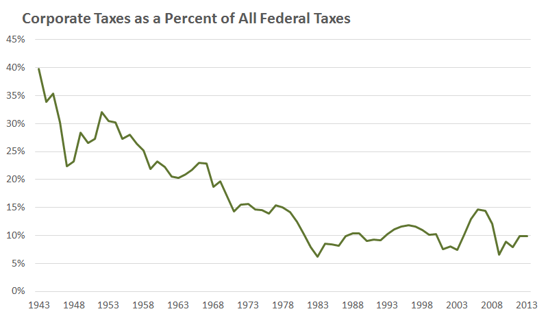 Measure corporate taxes as a percent of all federal government tax receipts, and you get this: