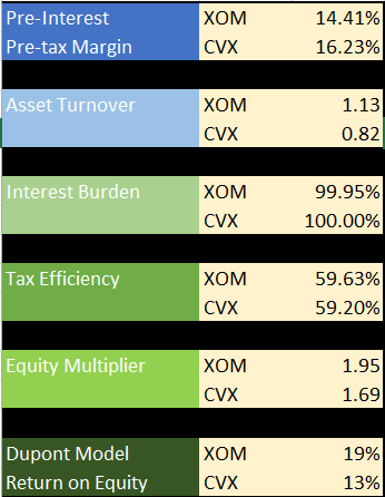 If you look at the breakdown of returns, the differences between interest burden and tax efficiency are negligible. Chevron has a slightly better net income margin, but what puts ExxonMobil ahead is asset turnover and its capital structure -- as denoted by the difference in equity multiplier.