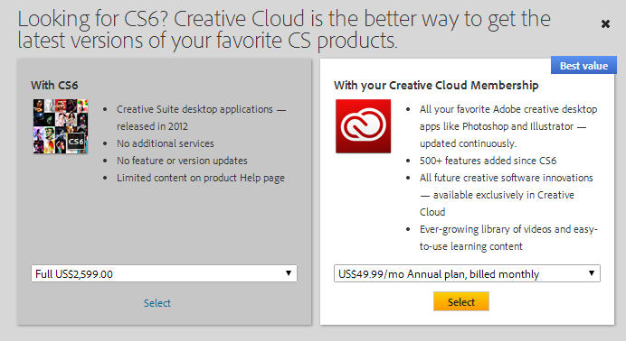 Adobe has completely shifted away from one-time licensing fees, forcing subscription plans on its customers, and this has the potential to backfire. Adobe still sells older versions of its software, but it does everything in its power to persuade potential customers that its subscription plans are the way to go.