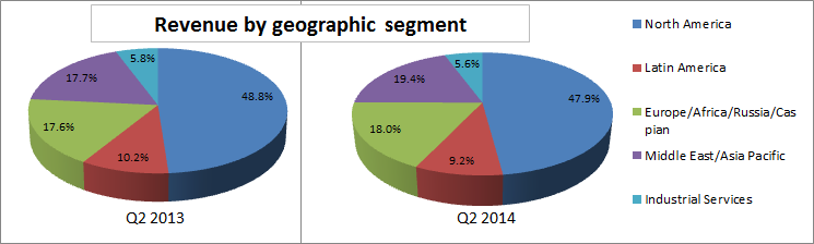 In North America, rig count for 2014 is expected to increase by a modest 5%. However, we notice that Baker Hughes' North American revenue growth far outpaced the rig count growth. During the second-quarter earnings call, CEO Martin Craighead mentioned that this phenomenon is likely to continue because service intensity per well is expected to go up. In other words, oil producers are willing to pay service providers such as Baker Hughes to not only complete more wells, but to increase the productivity per well. Keep in mind, North America accounts for almost half of the company's total revenue.