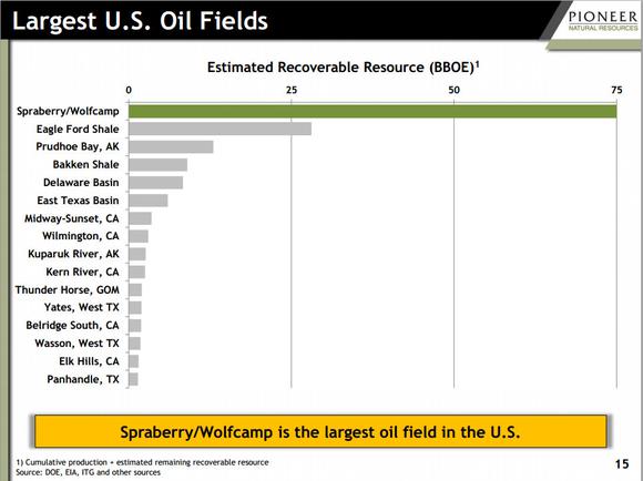 But when it comes to oil in particular, three plays currently stand out: The Bakken shale in North Dakota and Texas' Eagle Ford and Permian Basin shale plays, which include the Spraberry/Wolfcamp and stacked oil shale plays in the Delaware Basin. These shale plays are by far the biggest oil fields in the U.S. and among the largest in the entire world. As the following slide from an Pioneer Natural Resources (PXD +0.00%) investor presentation shows, the biggest shale play of them all is the Spraberry/Wolfcamp, which is nearly three times larger than the Eagle Ford shale.