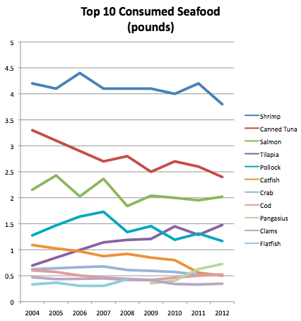 The types of seafood we're eating is also changing, reflecting rising costs. Although shrimp, canned tuna, and salmon have consistently remained the top three choices for consumers, they've fall sharply in the past 10 years, while cheaper fish such as tilapia and pangasius -- which you've probably seen in the supermarkets as swai -- are rising sharply. In fact, swai has replaced flatfish like flounder in the top 10 seafoods consumed.