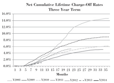 Of course, there are risks -- including that a borrower will fail to pay back the loan. Lending Club provides this chart of charge-offs in its registration statement: