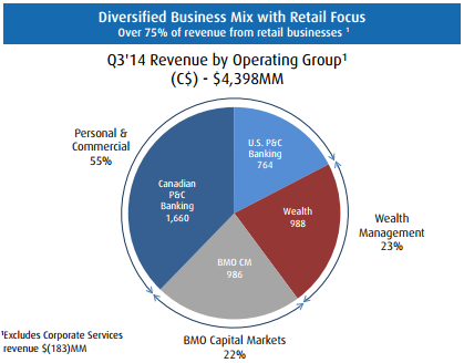In addition, as the company noted in the chart to the right, it offers admirable diversity in its business mix. Bank of Montreal has a balanced amount of top-line revenue coming from both Canada and the United States from its personal and commercial banking units. It also has solid performance from its capital markets and wealth management teams.