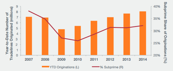 However, the overall loan volume is higher today. Doing the math, you'll find that the number of subprime auto loans in the first half of 2014 adds up to 2.6 million borrowers -- about equal to the 2.6 million subprime auto loans for the same period in 2007.