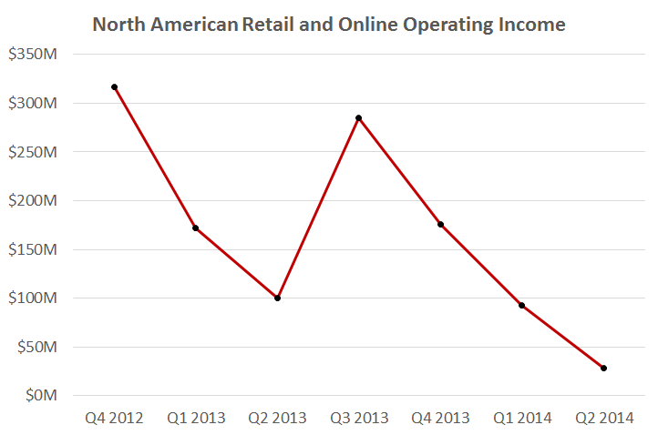 Store closings may sound like a bad thing, but Staples' profitability has suffered recently from simply having too many stores. Here's a chart showing the operating income that Staples derived from its North American retail and online segment over the past couple of years.