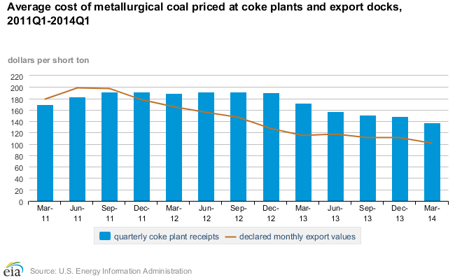 Since that time, though, the combination of waning demand and several new mines coming online has sent coking coal prices crashing. As of the last quarter, those same monthly export values dropped all the way to $101.