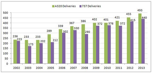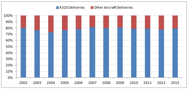 Air France was the launch customer of the A320, taking its delivery in March 1988. Since then, the company's delivered 6,171 units and had orders for 4,754 more as of July. In the past 12 years, Airbus dispatched 4,255 units, which made up approximately 78% of its total deliveries. In 2013, the aero major made a record 493 deliveries as demand for fuel-efficient aircraft soared.