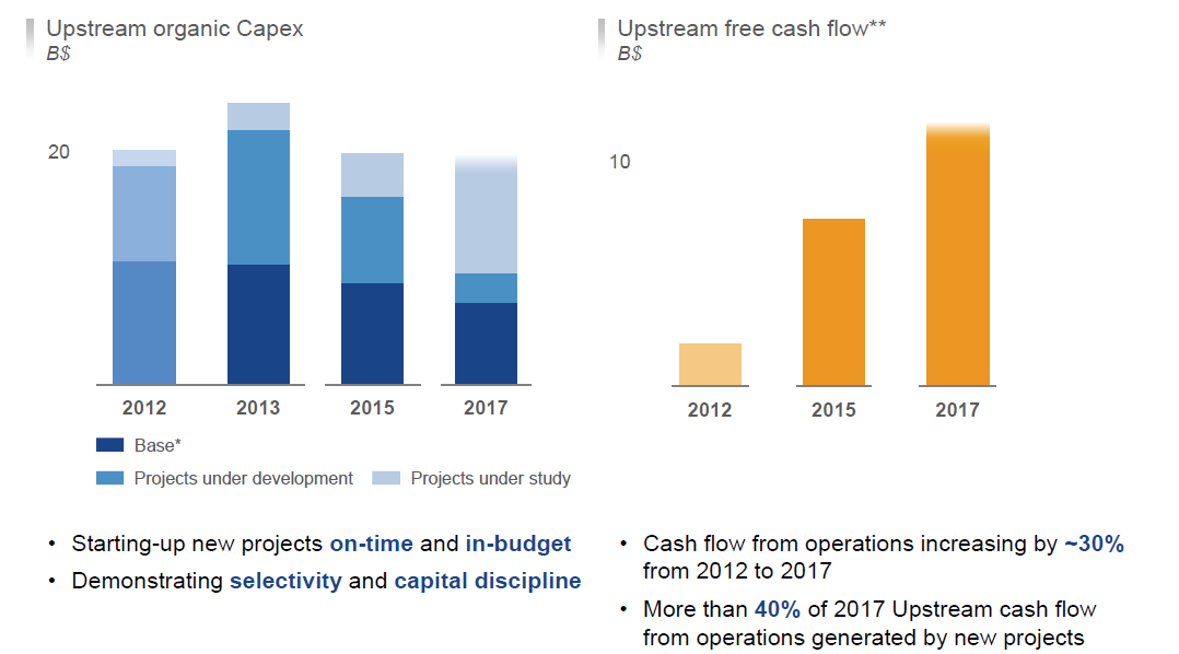 Clearly, this is not a great model for future success, but there are efforts in place that should improve this. The first is that set of new projects that have the potential to generate high cash margins mentioned above, but the second part is that the company is adjusting its production base though divestmetns and sales to reduce the need to spend money to maintain production at older producing assets. Total estimates that its collective decline rate for its producing assets is in the 3-4% range, which will allow the company to reduce its maintenance and overall capital expenditures