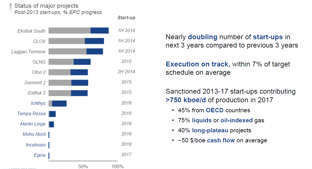 The second important point in these numbers is the cash flow per barrel of oil equivalent. Total estimates that this suite of projects will net $50 of operational cash flow per barrel equivalent, which would be very impressive if it can acutally be achieved. Top independent oil producer ConocoPhillips estimates that only 40% of its best projects can achieve a barrel equivalent margin of greater than $40, so a $50 average cash margin across the entire project portfolio is extremely ambitious and could go a long way in improving returns.