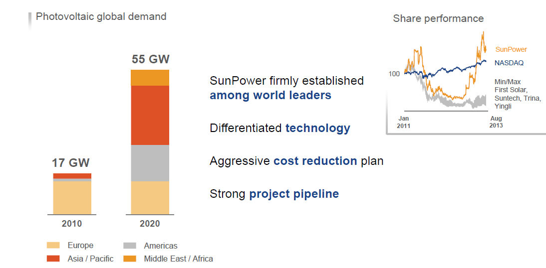 Calling Total an integrated oil and gas company may not be the right term. Perhaps a more appropriate term would be a diversified energy company, because Total has the largest exposure to alternative energy of its peers. Unlike the other big players that use solar and wind projects as a means for potentially offsetting carbon emissions from its oil, Total actually has investments in the alternative space built to grow the company through its 60% ownership stake in solar panel manufacturer SunPower (SPWR +0.00%). Total estimates that demand for photovoltaic panels will more than triple between now and 2020, and SunPower's position as a technology leader will differentiate it from the rest.