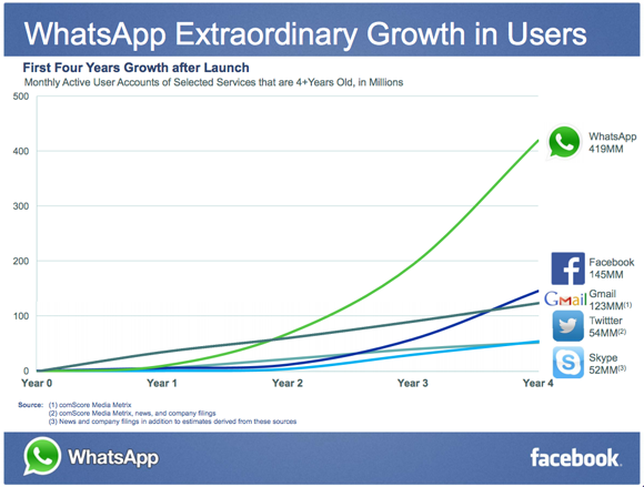 Facebook released this graphic shortly after purchasing WhatsApp, showing the messaging app's growth four years after launch, compared to other popular products:
