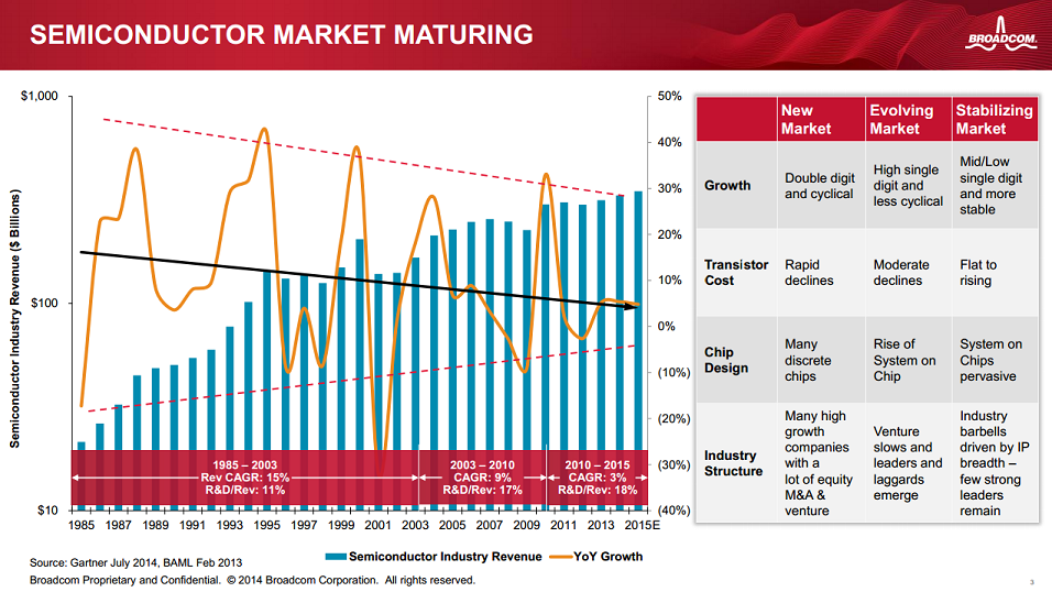 One of the long-term trends in the computing industry has been toward integration, particularly as end-markets mature. Reinforcing that point is the following slide shown during Broadcom's presentation at the Citi Technology Conference:
