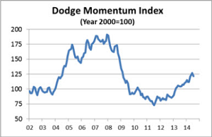 Likewise, McGraw Hill Construction's Dodge Momentum Index, another barometer for non-residential projects, gained 16.5% year over year, in the month of July. The Index has climbed steadily over the past few years, as evidenced by the graph on the right. Residential construction is also on an upswing: July housing starts grew 16% sequentially and 22% year over year.