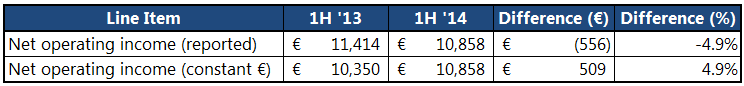 One of the first things that caused me a bit of hesitation for the bank headquartered in Spain is the massive effect currency fluctuations can have on its operating results. A simple glance at its reported net operating income through the first half of 2014 reveals just how dramatic this can be: