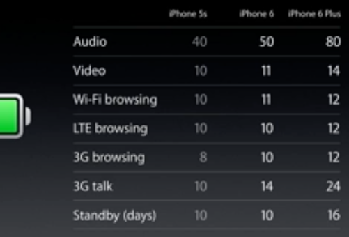 Battery comparison slide shown during Apple's Sept. 9 keynote. Columns are titled iPhone 5s, iPhone 6, and iPhone 6 Plus, from left to right.