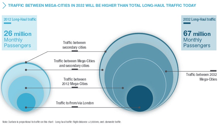 Airbus has coined the term "Aviation Mega-cities" for cities that handle more than 10,000 long-haul passengers every day. Of the 850 cities worldwide that facilitate long-haul flights, only 42 meet the criteria currently. However, this count is expected to skyrocket to 89 by 2023, while daily long-haul traffic passengers (including to, from, and via Mega-cities) will grow from 0.8 million in 2012 to 2.2 million. Leahy strongly believes that demand for A380 will be driven by these Mega-cities, which will account for 99% of all international air traffic.