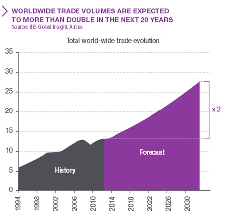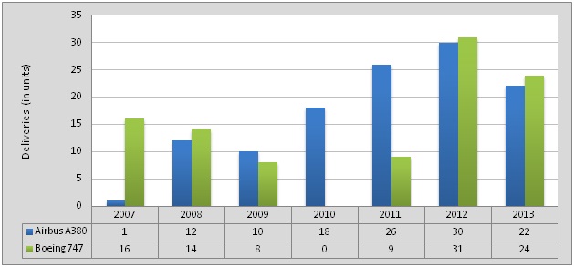 Airbus expects similar trends for the A380 freighter as freight traffic is expected to grow at a CAGR of 4.8% over the next 20 years. According to the company's Future Payloads Freight Forecast 2013-2032, global freighter fleet will expand from 1,645 units in 2013 to 2,905 units by 2032, fueled by increase in worldwide trade. There will be a requirement of more than 870 units -- midsize and large freighters combined. Replacement of the aging fleet will also drive demand.