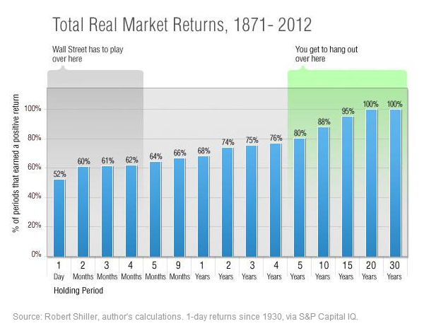 The biggest risk investors face is losing money between now and whenever they'll need it (retirement, school, etc.). The good news for you -- and bad news for Wall Street -- is that the odds of losing money drops precipitously the longer you're invested for.