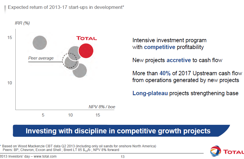 When looking to make a choice between integrated oil and gas companies, Total doesn't really stand out that much. The new production projects that it has planned between now and 2013 have some of the highest estimated rates of return in the business. According to management, these new projects should generate $50 per barrel of oil equivalent in operational free cash flow.