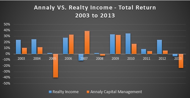 In fact, Realty Income outperformed Annaly eight of the 10 years shown below.