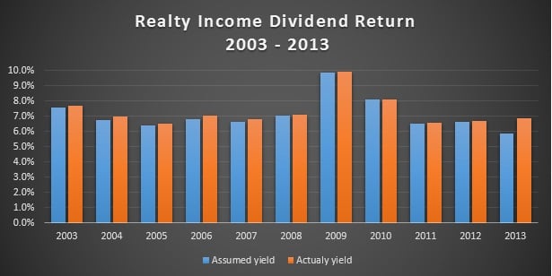In the same time, Realty Income increased its dividend every year. Because dividend yield (the formula) assumes a stable dividend, investors would have received a greater dividend return than the "assumed yield" every year.