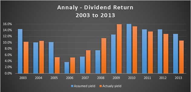 Consider the chart below, the blue bars shows Annaly's dividend yield at the start of each year, or "assumed yield," and the orange shows the actually dividend return for the year. What this means is that in six of the ten years – between 2003 and 2013 – Annaly had to make cuts their dividend.