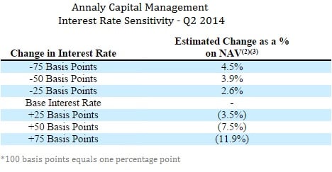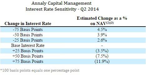 Annaly also uses leverage -- or, borrow against their equity -- to magnify returns. The more leverage the company uses, the more dramatic interest rates changes effect assets values. This is why when interest rates likely to rise, Annaly will reduce its leverage, and therefore hold less assets and make less income.