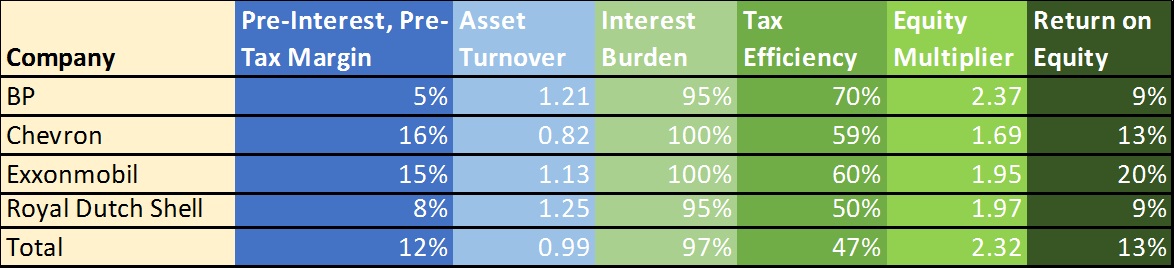 Thanks to strong margins and a high asset turnover rate from its high sales but low-margin downstream business, Exxon looks to be the strongest performer of all the companies in the group, with Chevron and Total in a distant second.
