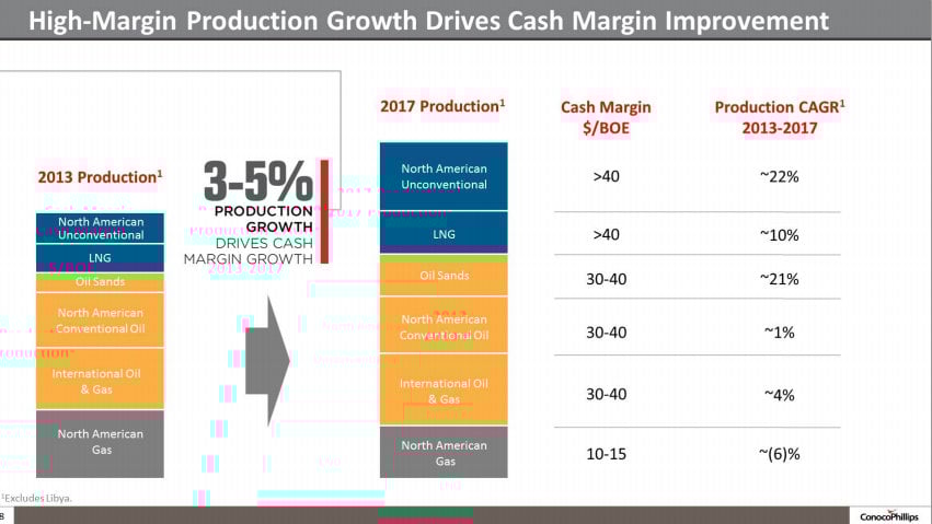 Because the margins are as good if not better, ConocoPhillips is making the right move to invest in safer geographies given its issues in the past. This will help the company meet its goal to grow production and margins by 3%-5% each year, as it doesn't have to worry about those margins being squeezed by additional taxes. Further, it can deliver much faster growth by focusing on unconventional production, as the lead time for new wells can be a matter of months as opposed to years for large projects like Clair.