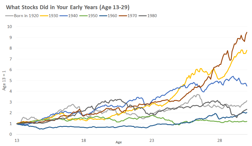One reason finance is a breeding ground for disagreement is because everyone gets their own version of history based on their own unique life experiences. And since markets are so volatile – booms and busts can last for years on end -- there's a lot of variability in those experiences depending on what year you were born.