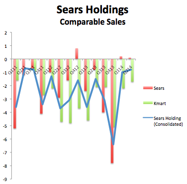 Revenues last quarter tumbled 10%, and while that was due in part to the Lands' End spinoff and closing stores, comparable sales fell yet again as Kmart dragged down the whole even as they were barely positive at Sears' namesake stores.