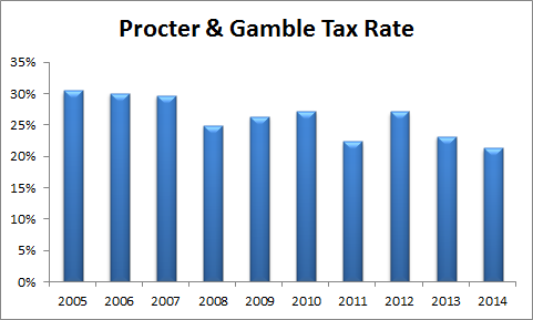 Procter & Gamble's tax rate has been declining for years as it shifts profits overseas. Source: Morningstar.