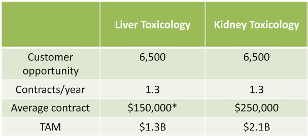 Secondly, the company has already shown that providing five to ten liver tests per compound can yield about $150,000 in revenue. It also believes that since there are fewer alternatives in the kidney market, it could charge upwards of $250,000 for kidney tests in the years to come.