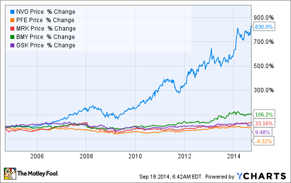 Danish pharma giant Novo Nordisk might offer one of the smaller dividends in the industry, with a mere 1.3% yield, but this stock's been an investor's dream recently. Over the past 10 years, Novo's shares have jumped by a whopping 830%, far outpacing the stock gains from many of the other big names in big pharma.