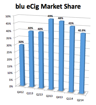 Although Lorillard currently has the leading electronic cigarette in blu eCig, and also bought the SkyCig brand in the U.K., market share is falling. Despite a national advertising campaign, blu's market share fell to 40.9% in the second quarter from 45% in the first and its peak of 49% in the third quarter of 201.