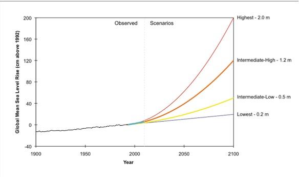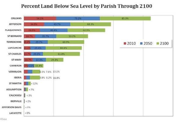 According to Tim Osborn of the National Oceanic and Atmospheric Administration (NOAA) and Steve Gill, senior scientist at the agency's Center for Operational Oceanographic Products and Services, by 2100 much of southeastern Louisiana will be under 4.3 feet of water. This area faces the fastest rate of sea level rise in the world.