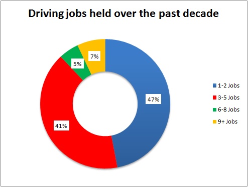 On the other side of the coin, nearly 41% of those polled have experimented with three to five jobs over the past decade, indicating that it's just as easy to find a job in this market if you're not happy with your current one. That perhaps explains the high driver turnover rates in the trucking industry: According to the American Trucking Association, large carriers reported an annualized turnover rate of 92% for the first quarter this year, making it the ninth consecutive quarter with rates topping 90%.