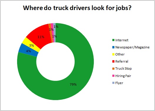 According to the survey, a meager 4% of those polled look at newspapers or magazines to find jobs. Technology has caught up swiftly with truck drivers -- a whopping 79% rely on the Internet as their primary job-search tool. Referrals are a distant second, with 11% share. In other words, trucking companies could consider giving job fairs and newspapers a miss and spend more time on the Internet instead when they're looking to fill their vacancies.