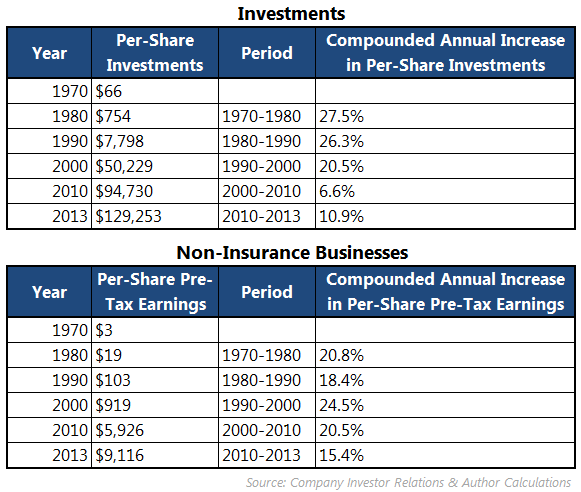 Since 1990, the earnings delivered by the non-insurance and operating businesses of Berkshire Hathaway -- think its manufacturing, railroad, energy, and other segments -- have grown at an average rate of 21.5% a year, whereas its investments have increased by 13%.
