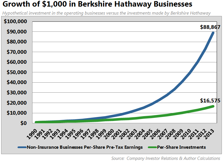 Or shown a little differently, the growth $1,000 of investments made by Berkshire Hathaway in 1990 would look radically different than $1,000 placed into its operating businesses: